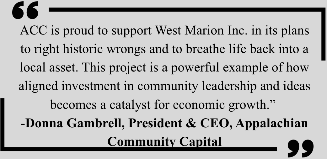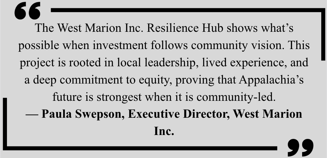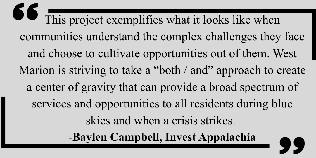 But what will matter even more is how the hub grows economic opportunity and enhances quality of life with better healthcare access, new opportunities for entrepreneurs and a place for community organizations to collaborate. Our communities deserve more than survival and preparing for survival. Appalachian communities are not simply resilient - they are civically engaged, culturally diverse, creative, intelligent, and booming with potential. West Marion Inc. is building what, in other places, might just be another community center. In this community, though, it’s a long-held dream finally taking shape. A place positioned to “be a durable engine for local wealth-building, cultural vitality, and long-term resilience in West Marion" (Opportunity Appalachia).