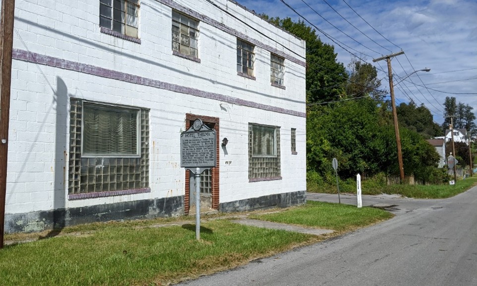 Both properties have been vacant since the 1990s. The Hotel Thelma is significant to African American cultural heritage at the local, regional, and national levels as a rare surviving, Black-owned safe haven from the Jim Crow era and a cornerstone of Bluefield’s historically Black commercial and social life. Located in the Bluefield Green Book Historic District (listed on the National Register for Historic Places under Criterion A for Black Ethnic Heritage, Social History, and Transportation), Hotel Thelma was one of five Bluefield businesses listed in the Negro Motorist Green Book. Included in the Green Book from 1950–1961, the Hotel Thelma is tied to the nationwide network of places that helped Black Americans travel with greater safety and dignity when discrimination restricted access to lodging, meals, and services.